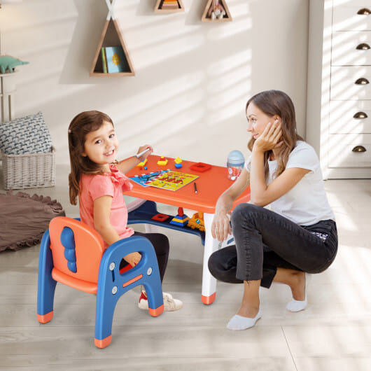 Specifications: Color: Blue Yellow Gray Material: HDPE Table size: 31″ x 19.5″ x 19.5″ (L x W x H) Chair size: 15″ x 16.5″ x 20.5″ (L x W x H) Net weight: 15 lbs Weight capacity of table: 44lbs Weight capacity of chair: 66lbs Suitable for age: 1-5 years old Box Qty: 1(May vary by batch)Package includes: 1 x Table 1 x Chair 3 x Building blocks set 1 x Instruction