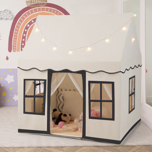 Specifications: Color: Beige Material: Polyester cotton PVC coral welvet Overall dimension: 47.5″ x 40″ x 54″ (L x W x H) Net weight: 10 lbs Battery type:2 x AA Batteries (Not Included) Suitable age: 3 + Box Qty: 1(May vary by batch)Package includes: 1 x Kids play tent 1 x Star string light 1 x Non-slip mat 1 x Instruction